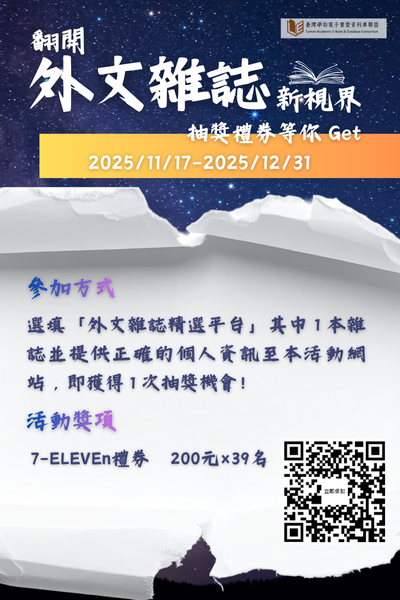 活動介紹:於活動期間內,選填「外文雜誌精選平台」其中1本雜誌並提供正確的個人資訊至本活動網站,即獲得1次抽獎機會。
