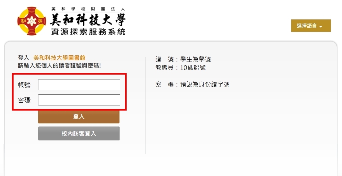 步驟1:先進入本校圖書館首頁→電子資源→JUMPER資源探索服務系統→輸入帳號及密碼登入。