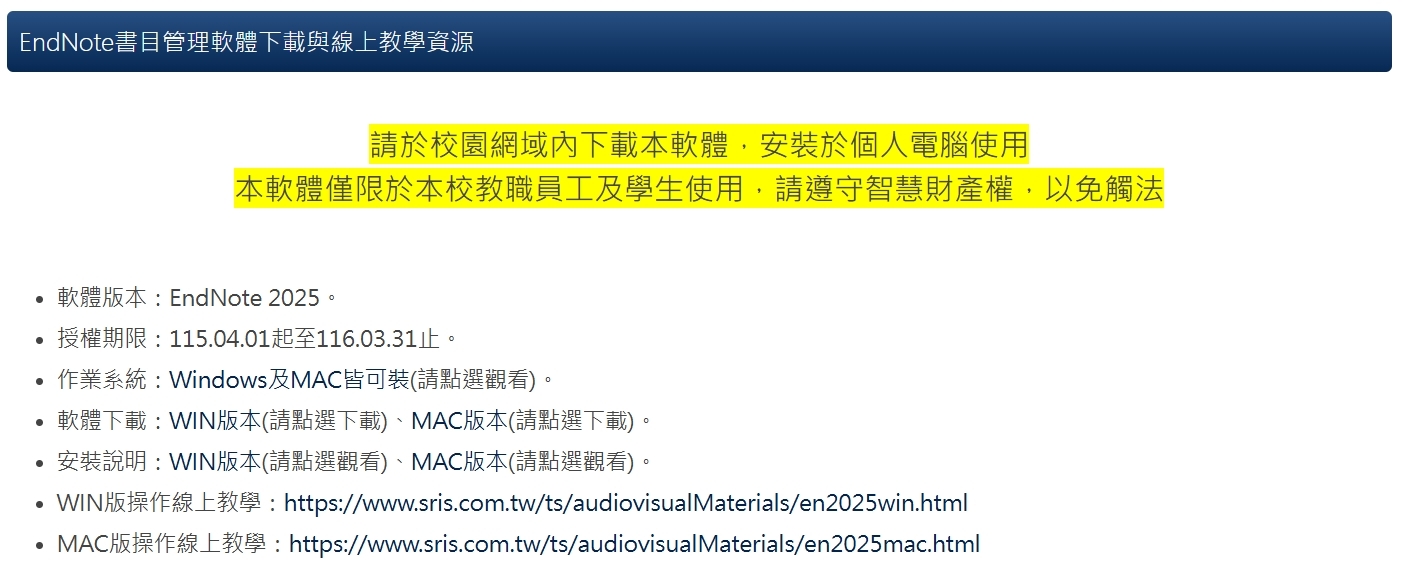 EndNote書目管理軟體下載步驟: