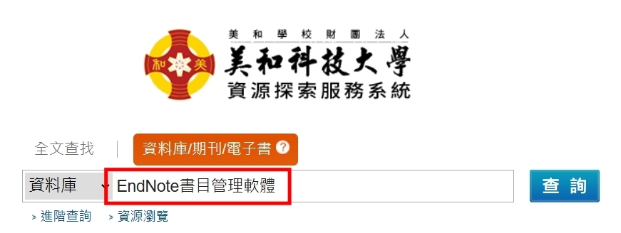 步驟2:進入JUMPER資源探索服務系統→點選"資料庫/期刊/電子書" →於資料庫欄位輸入【EndNote書目管理軟體】 →查詢。